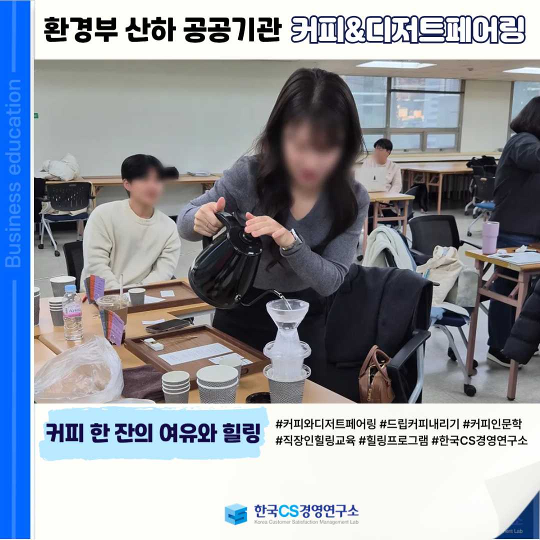 <환경부 산하 공공기관>에서 커피의 향미를 경험하는 추출 및 테이스팅 과정을 통해 직원들의 심리적 안정감과 정서적 회복력을 높이고, 커피와 페어링 디저트를 함께 즐기며 감각적 치유와 감성 교류를 경험할 수 있도록 ‘커피&디저트페어링’ 프로그램을 진행했습니다.