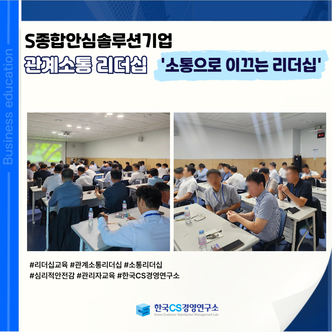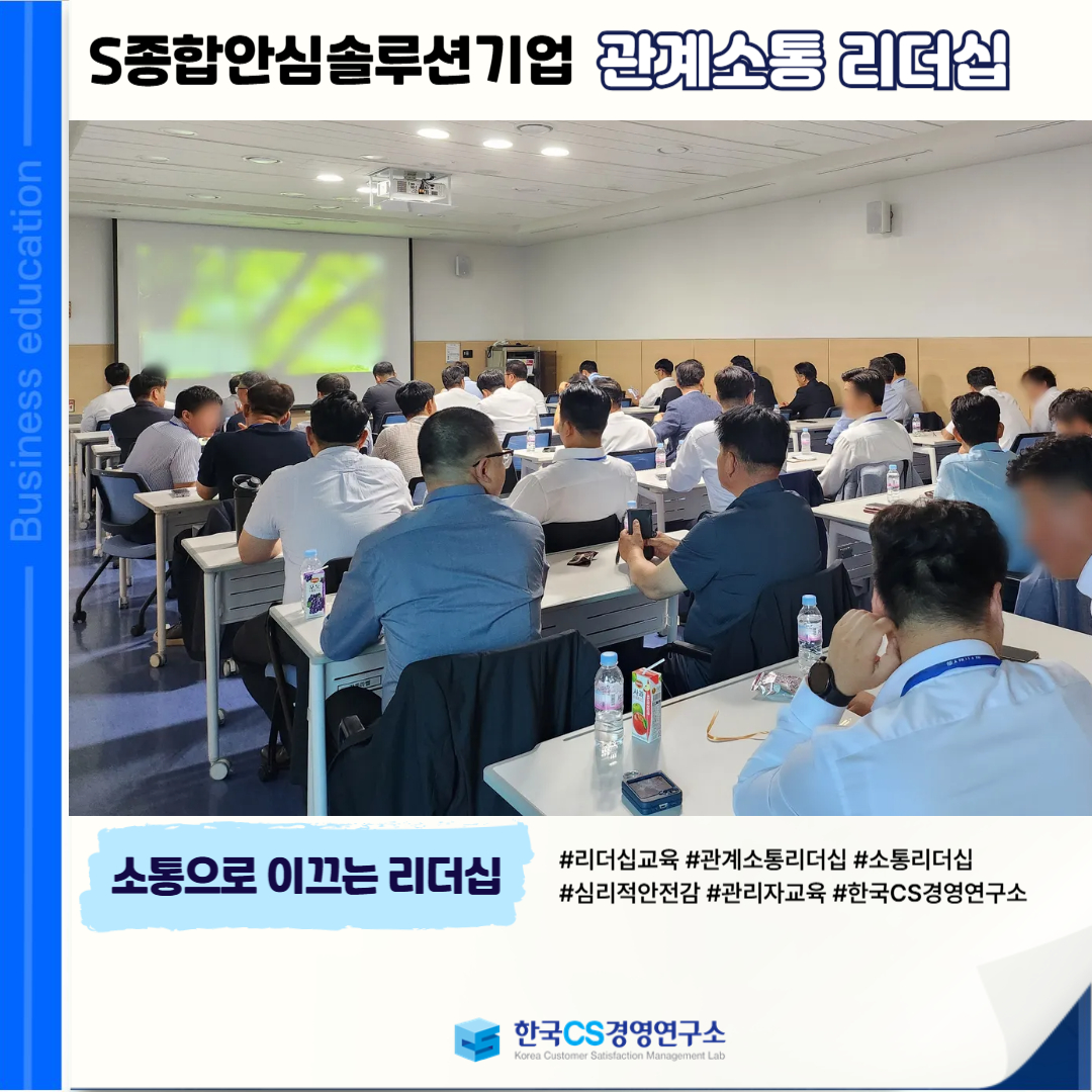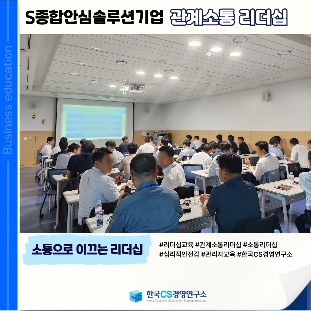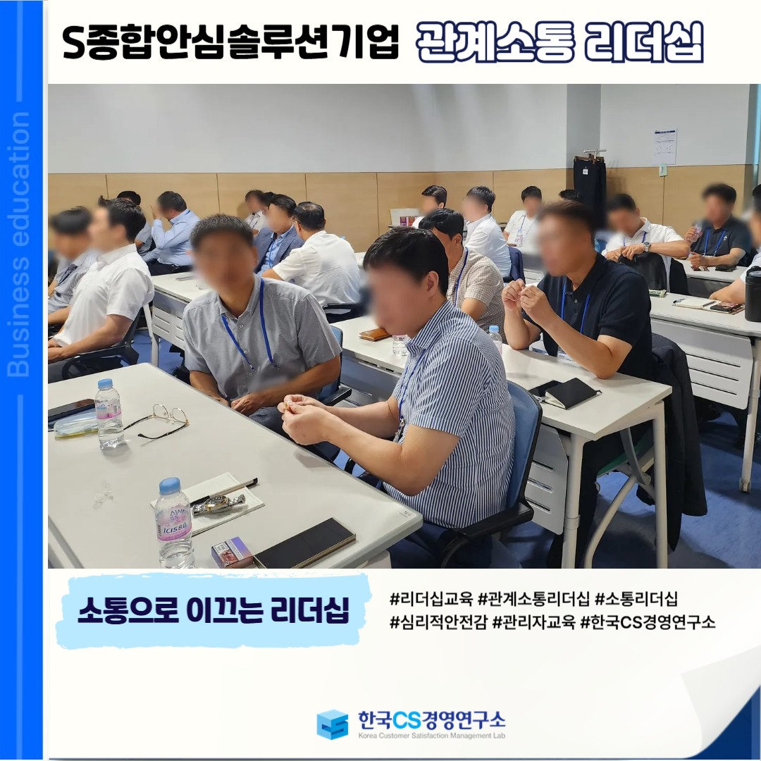 <S종합안심솔루션기업>에서 관리자급 직원들을 대상으로, 구성원 간 갈등을 조율하고 소통 역량을 통해 리더십을 강화하는 ‘관계소통 리더십’ 교육을 진행했습니다.