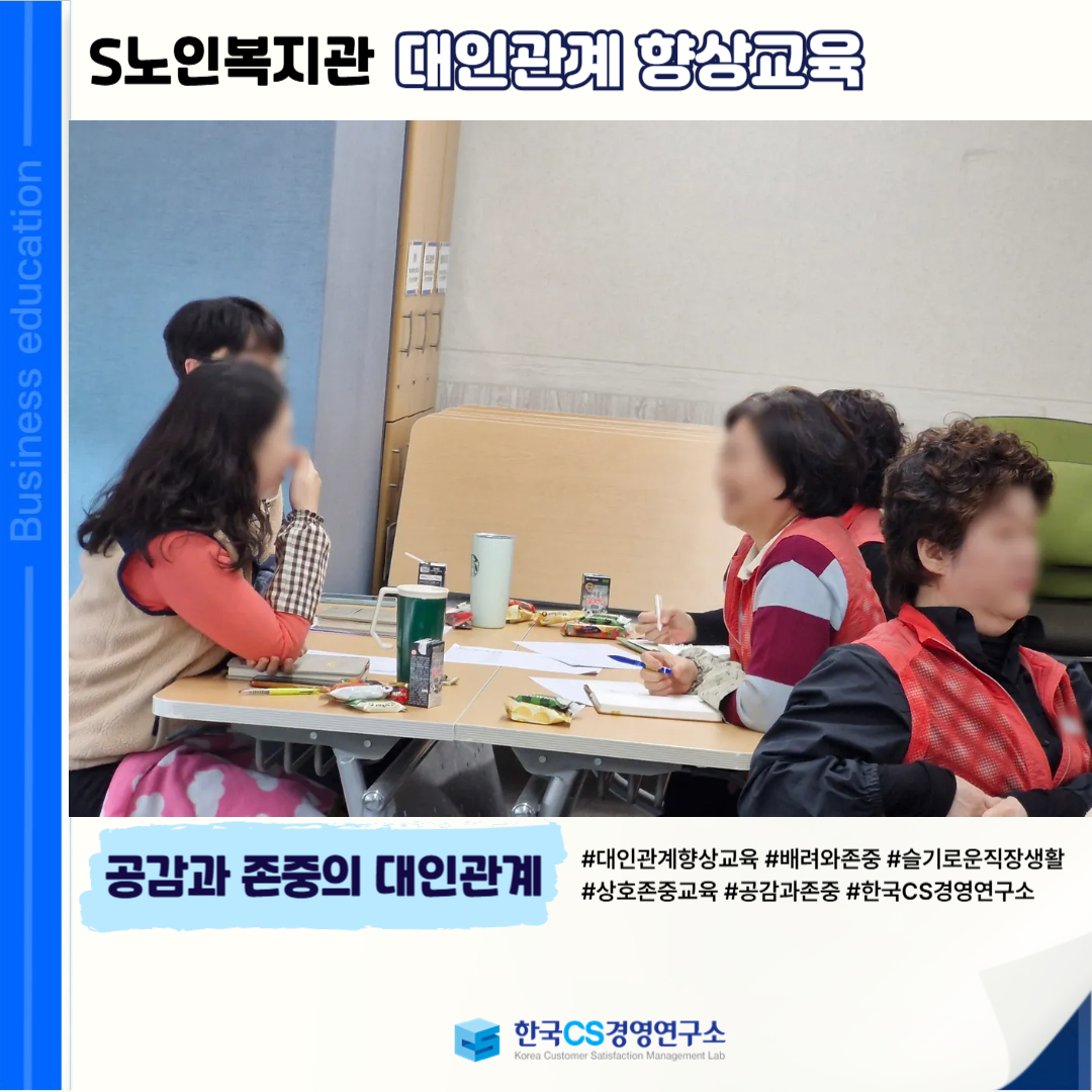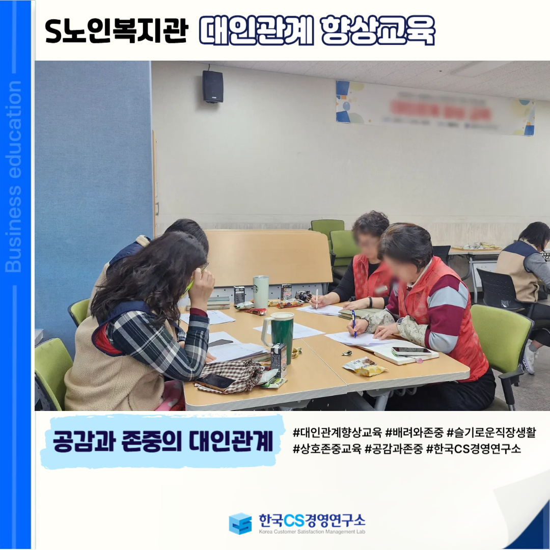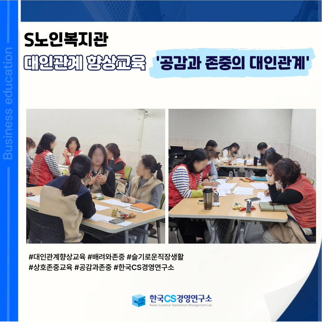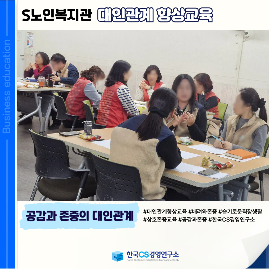 <S노인복지관>에서 사회복지 직원들을 대상으로, 사회복지 현장에서 만나는 다양한 대상자와 동료를 존중과 공감으로 이해하고 따뜻한 소통을 통해 건강한 관계를 형성하기 위해 ‘대인관계 향상교육’을 진행했습니다.