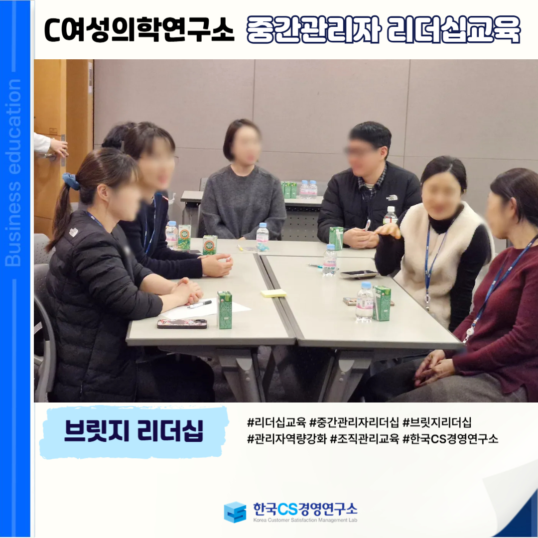 <C여성의학연구소>에서 중간관리자가 조직 내 소통의 브릿지 역할을 수행하며 상·하 간 신뢰를 연결하고, 협업과 성과를 이끄는 리더십 역량을 강화하기 위해 '중간관리자 브릿지리더십교육'을 진행했습니다.