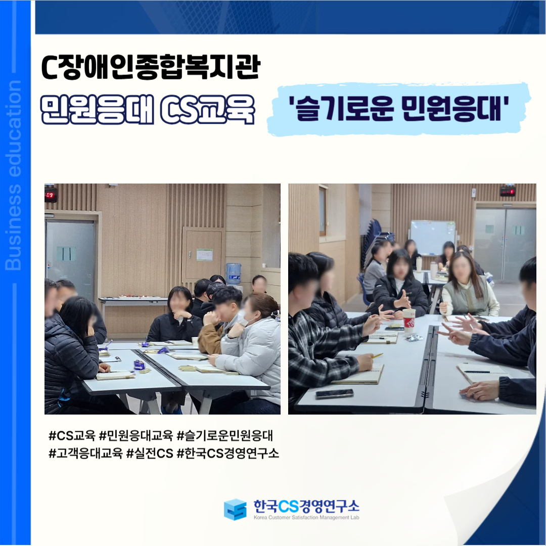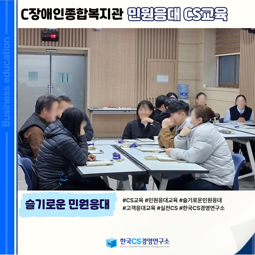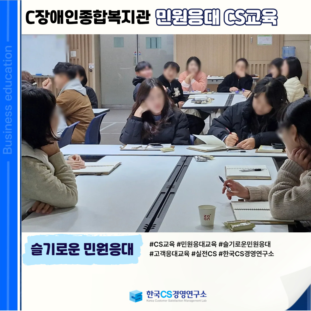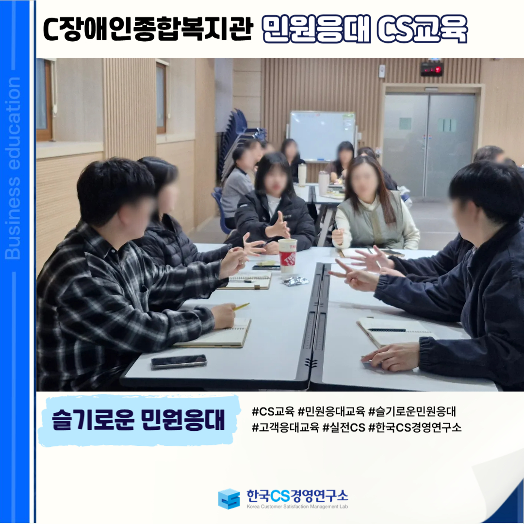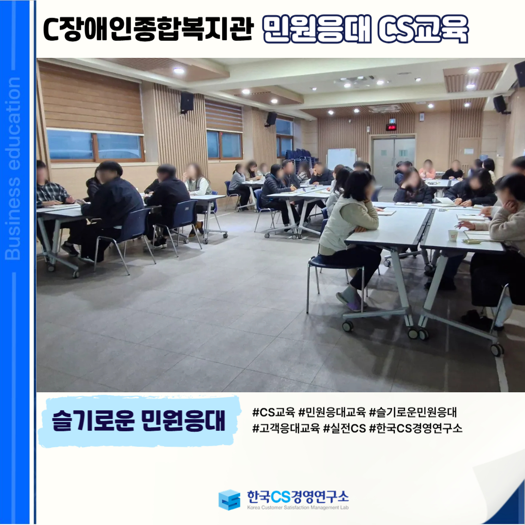 <C장애인종합복지관>에서 민원인의 입장을 공감하고 상황에 맞는 응대 역량을 강화하여, 신뢰받는 민원 서비스를 제공하기 위해 ‘민원응대 CS교육’을 진행했습니다.