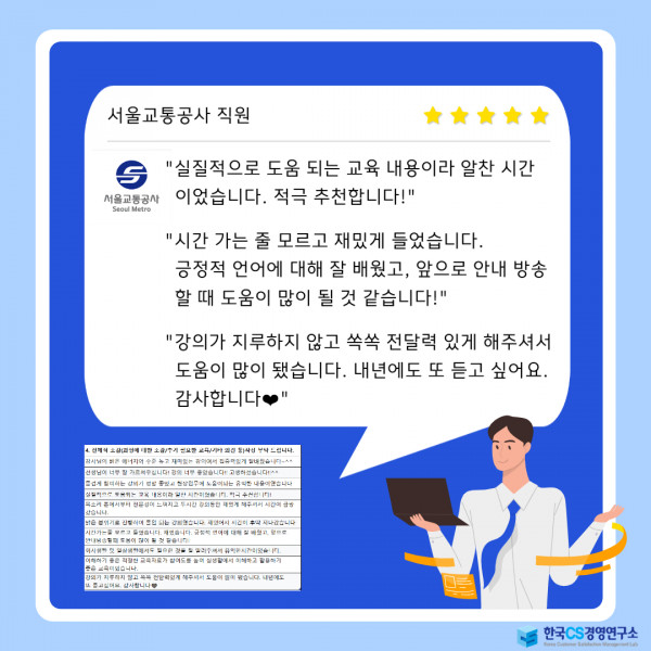 교육 진행 후 서울교통공사에서 정혜미 강사님께 교육 후기 보내주셨습니다.
