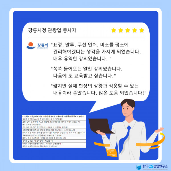 "표정, 말투, 쿠션 언어, 미소를 평소에 관리해야겠다는 생각을 가지게 되었습니다. 매우 유익한 강의였습니다. "