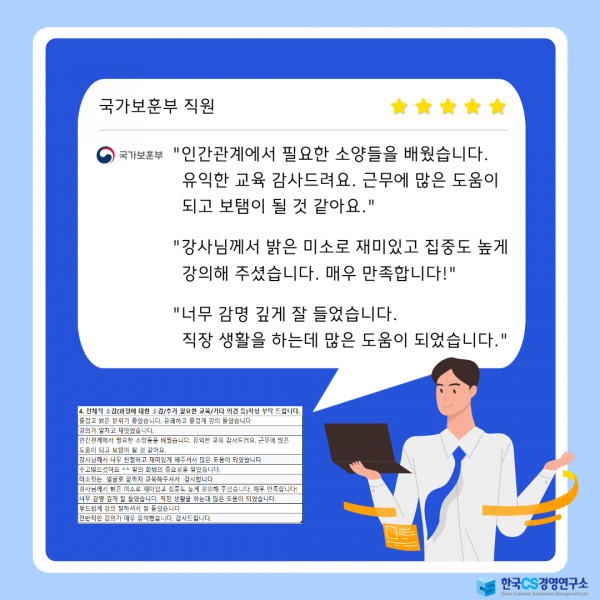 "인간관계에서 필요한 소양들을 배웠습니다. 유익한 교육 감사드려요. 근무에 많은 도움이 되고 보탬이 될 것 같아요."