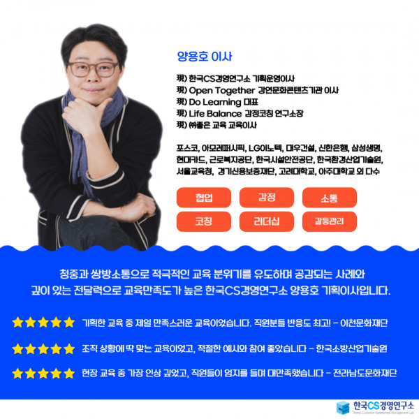 기업들의 옳은 선택이 될 수 있는 교육 가치 기반으로 기업 HRD&CS Total 분야의 대표 수행기관으로서 한국CS경영연구소는 개인과 기업의 성장에 함께하겠습니다.