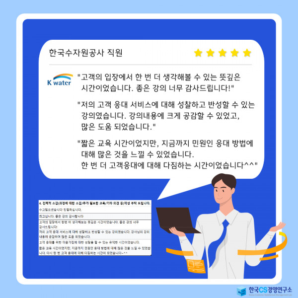 "저의 고객 응대 서비스에 대해 성찰하고 반성할 수 있는 강의였습니다. 강의내용에 크게 공감할 수 있었고, 많은 도움 되었습니다."
