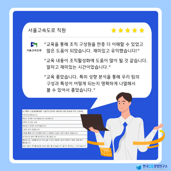 "교육을 통해 조직 구성원을 한층 더 이해할 수 있었고 많은 도움이 되었습니다. 재미있고 유익했습니다!"