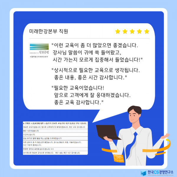 "필요한 교육이었습니다! 앞으로 고객에게 잘 응대하겠습니다. 좋은 교육 감사합니다."