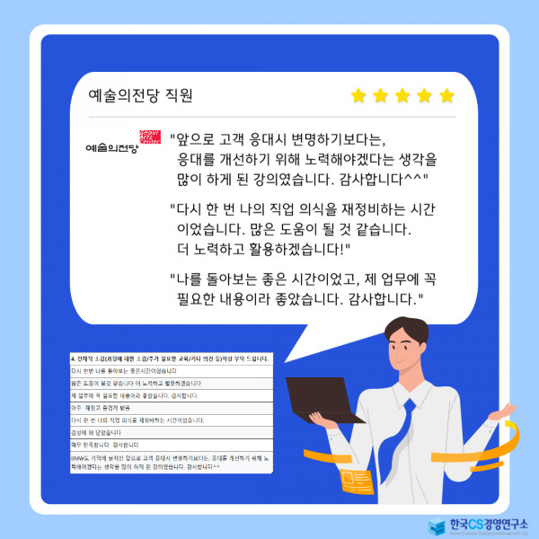 "앞으로 고객 응대시 변명하기보다는, 응대를 개선하기 위해 노력해야겠다는 생각을 많이 하게 된 강의였습니다. 감사합니다^^"