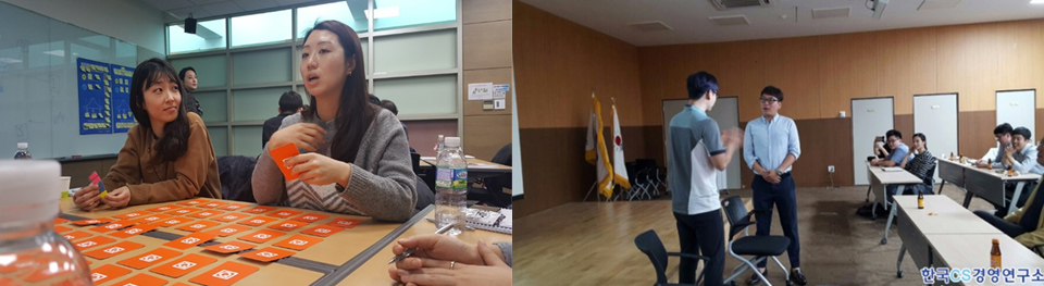 [2부: 팀 협업 학습] 팀 협업의 중여성을 인식 할 수 있는 단계 [프로그램 설명서] tvN ‘더 지니어스’에 삽입된 두뇌게임으로 팀 빌딩 강의에 맞춘 교육 프로그램임 각 조직원들로 구성된 팀은 풍요의 땅과 기근의 땅으로 이동을 하며 포인트를 쌓는 구조로 구성원간 긴밀한 소통과 협력을 통해 포인트를 쌓으며 풍부한 조직활성화를 꾀할 수 있음 |
