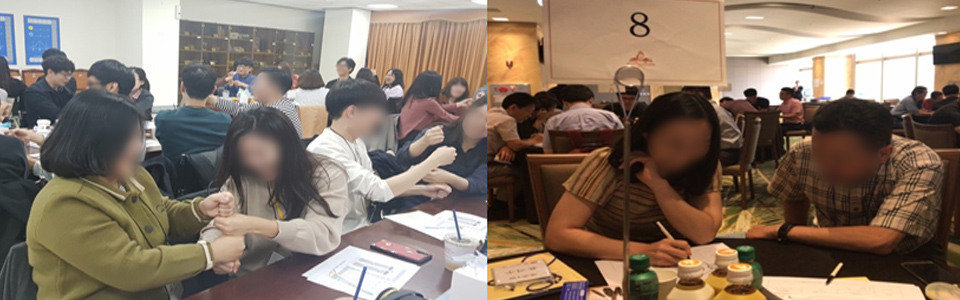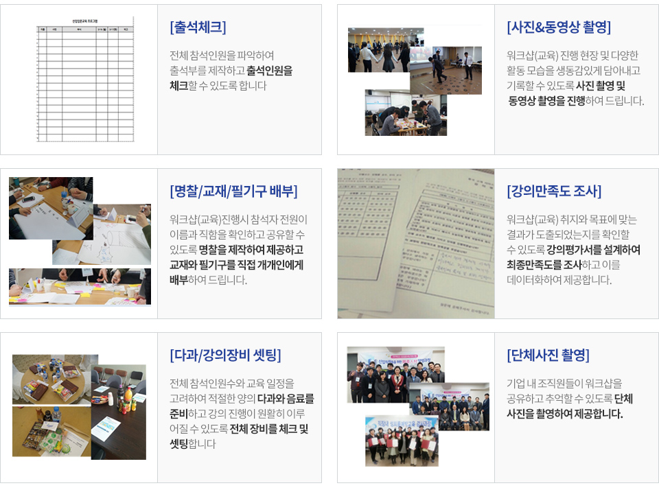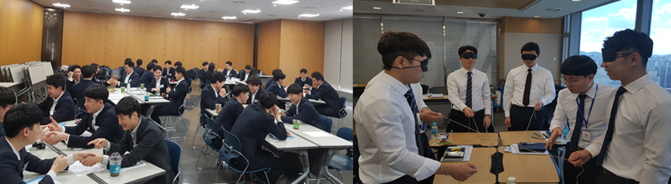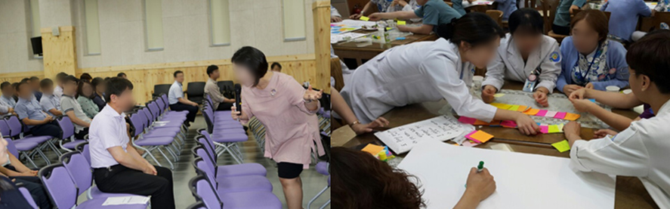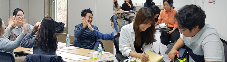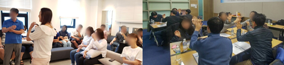 - 방탄소년단팀워크의 비밀! 혼자 숲을 이루는 나무는 없다. 조직활성화 이론 100-1=0 - 우리기업 조직활성화 방안; 집단사고 vs 집단지성의 차이 알기 - ‘너도나도’ 미션을 통해 알아보는 함께 일하고 싶은 동료 Best 3 - ‘종이컵 화합 미션’을 통해 ‘조직에 대한 생각' ‘동료에 대한 생각' ‘팀웍에 대한 생각’ 나누기 - 직원들과 벽없는 소통을 위한 소통카드를 활용! 직원들간의 핵심가치 존중 및 인정하기 - 동료의식 고취를 위한 존중과 신뢰가 담긴 따뜻한 언어 ‘잊지 못할 한마디 최고의 감동’릴레이 - 4명(멍부/똑부/멍게/똑게)의 상사Vs 4명의 부하직원의 생각차이 및 서로 존중하기 - ‘조직활성화 교통표지판’ 만들기! 시각화로 직원들의 활성화 방안 발표 - 만다라트기법을 통해 알아보는 조직활성화(예절,, 소통) 방안 최고 의견 선정 - 함께 일하는 직원들과 즐겁게 일하는 환경 만들기 위한 노력 을 위한 생각 변화 |