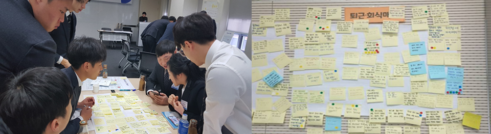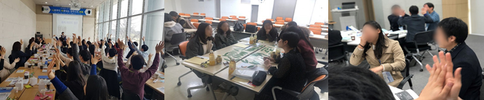 - 우리기업 조직활성화 방안; 집단사고 vs 집단지성의 차이 알기 - ‘종이컵 화합 미션’을 통해 ‘조직’ ‘동료‘ ‘팀워크’ 에 대한 생각 나누기 - 동료의식 고취를 위한 존중과 신뢰가 담긴 따뜻한 언어 ‘잊지 못할 한마디 최 - ‘조직활성화 교통표지판’ 만들기! 시각화로 직원들의 활성화 방안 발표 - 함께 일하는 직원들과 즐겁게 일하는 환경 만들기 위한 노력 을 위한 생각 변화 |